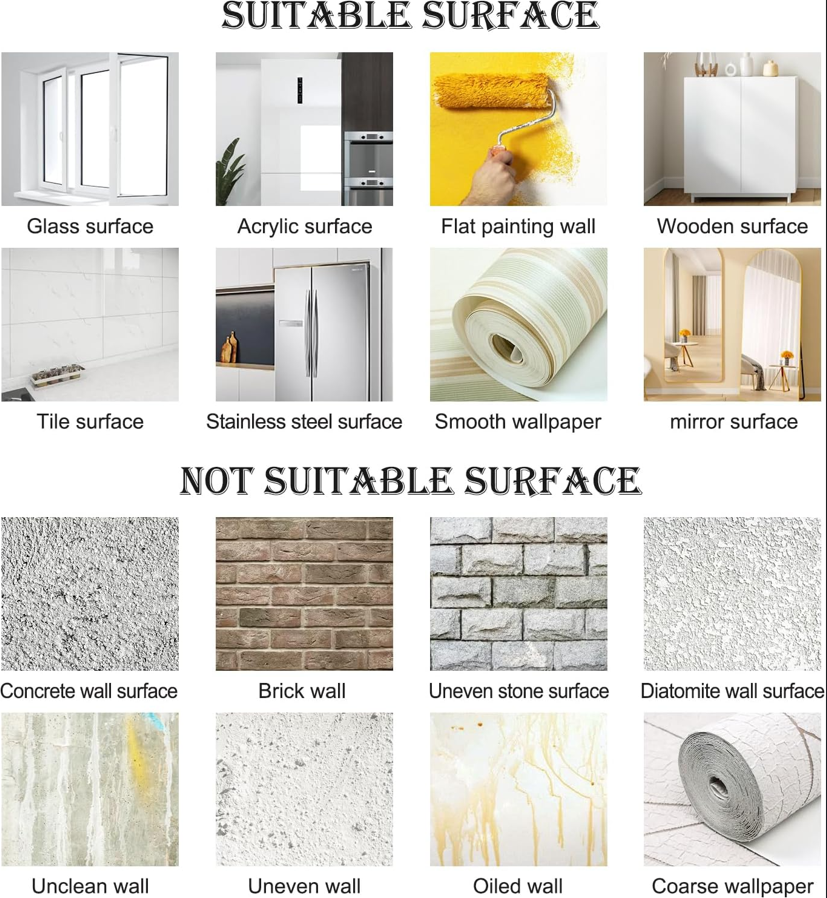 Easily applies to smooth and clean surfaces such as walls, doors, cabinets, mirrors, tiles, and more. Ideal for the living room, bedroom, bathroom, office, or even your TV or sofa backdrop.